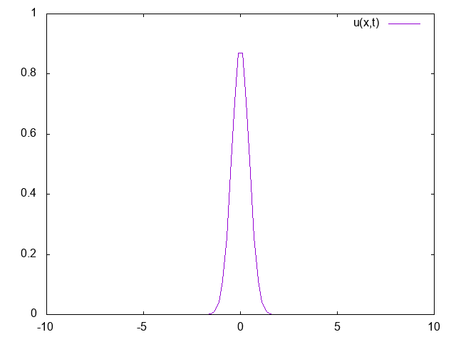 gnuplot> u(x,t)=exp(-x*x/(4*t))/sqrt(4*pi*t) gnuplot> t=0.1 gnuplot> Tmax=5 gnuplot> dt=0.01 gnuplot> load "anim.gp" |